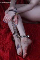 barefeet girls hogtied bound an bed. struugling against the ropes